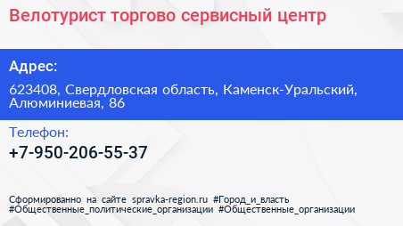 Велотурист, торгово-сервисный центр по адресу 623408, Свердловская область, Каменск-Уральский, Алюминиевая, 86 в дальнейшем Организация, размещена в следующих категориях: