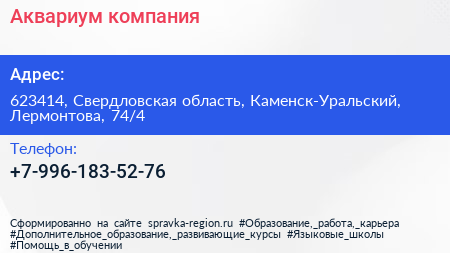 Аквариум, компания по адресу 623414, Свердловская область, Каменск-Уральский, Лермонтова, 74/4 в дальнейшем Организация, размещена в следующих категориях: