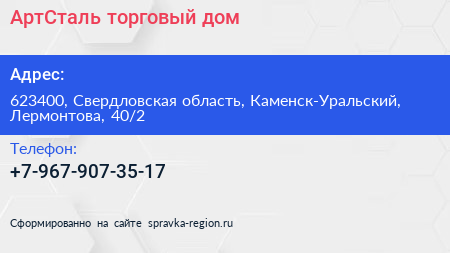АртСталь, торговый дом по адресу 623400, Свердловская область, Каменск-Уральский, Лермонтова, 40/2 в дальнейшем Организация, размещена в следующих категориях: