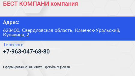 БЕСТ КОМПАНИ, компания по адресу 623400, Свердловская область, Каменск-Уральский, Кунавина, 2 в дальнейшем Организация, размещена в следующих категориях: