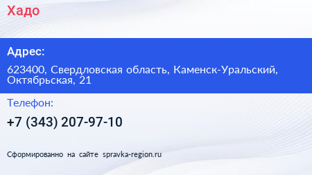 Хадо по адресу 623400, Свердловская область, Каменск-Уральский, Октябрьская, 21 в дальнейшем Организация, размещена в следующих категориях: