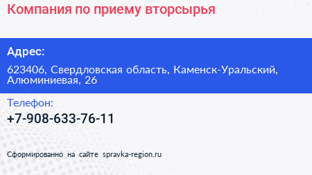 Компания по приему вторсырья по адресу 623406, Свердловская область, Каменск-Уральский, Алюминиевая, 26 в дальнейшем Организация, размещена в следующих категориях: