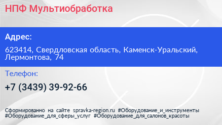 НПФ Мультиобработка по адресу 623414, Свердловская область, Каменск-Уральский, Лермонтова, 74 в дальнейшем Организация, размещена в следующих категориях: