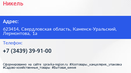 Никель по адресу 623414, Свердловская область, Каменск-Уральский, Лермонтова, 1а в дальнейшем Организация, размещена в следующих категориях:
