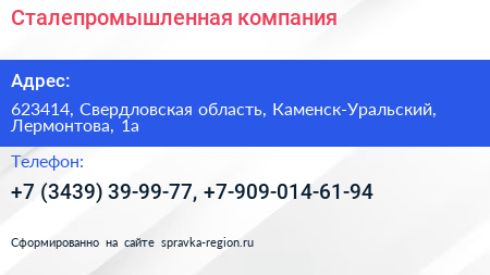 Сталепромышленная компания по адресу 623414, Свердловская область, Каменск-Уральский, Лермонтова, 1а в дальнейшем Организация, размещена в следующих категориях: