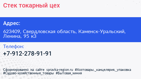Стек, токарный цех по адресу 623409, Свердловская область, Каменск-Уральский, Ленина, 95 к3 в дальнейшем Организация, размещена в следующих категориях: