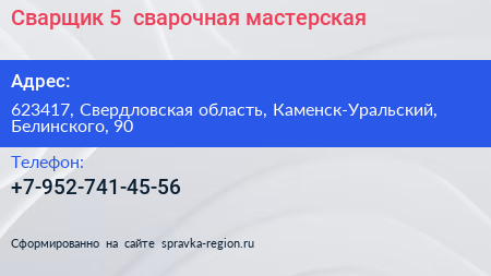 Сварщик 5+, сварочная мастерская по адресу 623417, Свердловская область, Каменск-Уральский, Белинского, 90 в дальнейшем Организация, размещена в следующих категориях: