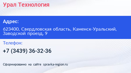 Урал-Технология по адресу 623400, Свердловская область, Каменск-Уральский, Заводской проезд, 9 в дальнейшем Организация, размещена в следующих категориях: