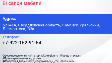 Е1, салон мебели по адресу 623414, Свердловская область, Каменск-Уральский, Лермонтова, 83а в дальнейшем Организация, размещена в следующих категориях: