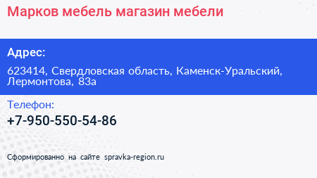 Марков-мебель, магазин мебели по адресу 623414, Свердловская область, Каменск-Уральский, Лермонтова, 83а в дальнейшем Организация, размещена в следующих категориях: