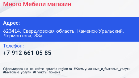 Много Мебели, магазин по адресу 623414, Свердловская область, Каменск-Уральский, Лермонтова, 83а в дальнейшем Организация, размещена в следующих категориях:
