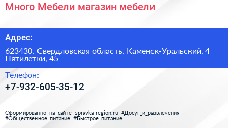 Много Мебели, магазин мебели по адресу 623430, Свердловская область, Каменск-Уральский, 4 Пятилетки, 45 в дальнейшем Организация, размещена в следующих категориях: