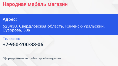 Народная мебель, магазин по адресу 623430, Свердловская область, Каменск-Уральский, Суворова, 38а в дальнейшем Организация, размещена в следующих категориях: