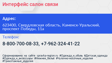 Интерфейс, салон связи по адресу 623400, Свердловская область, Каменск-Уральский, проспект Победы, 11а в дальнейшем Организация, размещена в следующих категориях:
