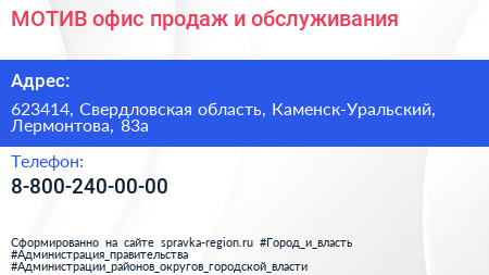 МОТИВ, офис продаж и обслуживания по адресу 623414, Свердловская область, Каменск-Уральский, Лермонтова, 83а в дальнейшем Организация, размещена в следующих категориях: