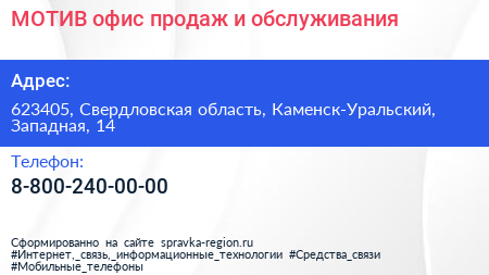 МОТИВ, офис продаж и обслуживания по адресу 623405, Свердловская область, Каменск-Уральский, Западная, 14 в дальнейшем Организация, размещена в следующих категориях: