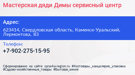 Мастерская дяди Димы, сервисный центр по адресу 623414, Свердловская область, Каменск-Уральский, Лермонтова, 83 в дальнейшем Организация, размещена в следующих категориях: