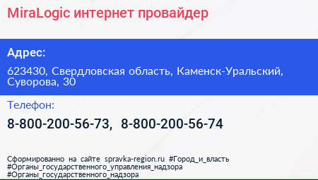 MiraLogic, интернет-провайдер по адресу 623430, Свердловская область, Каменск-Уральский, Суворова, 30 в дальнейшем Организация, размещена в следующих категориях: