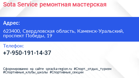 Sota-Service, ремонтная мастерская по адресу 623400, Свердловская область, Каменск-Уральский, проспект Победы, 19 в дальнейшем Организация, размещена в следующих категориях:
