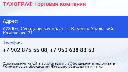 ТАХОГРАФ, торговая компания по адресу 623406, Свердловская область, Каменск-Уральский, Каменская, 31 в дальнейшем Организация, размещена в следующих категориях: