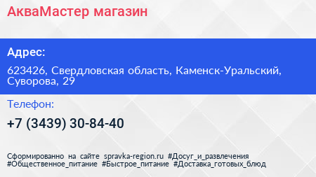 АкваМастер, магазин по адресу 623426, Свердловская область, Каменск-Уральский, Суворова, 29 в дальнейшем Организация, размещена в следующих категориях: