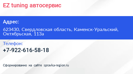 EZ-tuning, автосервис по адресу 623430, Свердловская область, Каменск-Уральский, Октябрьская, 113а в дальнейшем Организация, размещена в следующих категориях: