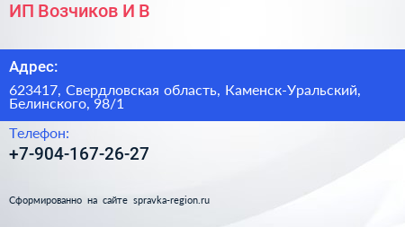 ИП Возчиков И.В. по адресу 623417, Свердловская область, Каменск-Уральский, Белинского, 98/1 в дальнейшем Организация, размещена в следующих категориях: