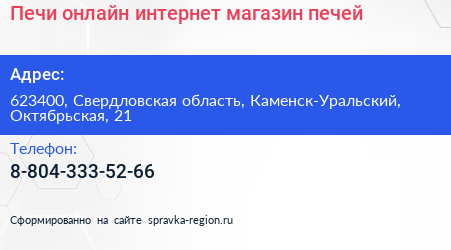 Печи онлайн, интернет-магазин печей по адресу 623400, Свердловская область, Каменск-Уральский, Октябрьская, 21 в дальнейшем Организация, размещена в следующих категориях: