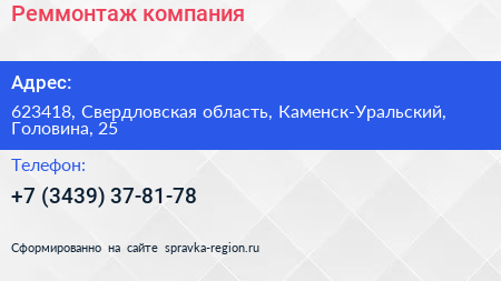 Реммонтаж, компания по адресу 623418, Свердловская область, Каменск-Уральский, Головина, 25 в дальнейшем Организация, размещена в следующих категориях: