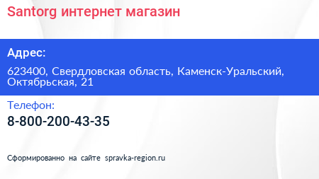 Santorg, интернет-магазин по адресу 623400, Свердловская область, Каменск-Уральский, Октябрьская, 21 в дальнейшем Организация, размещена в следующих категориях: