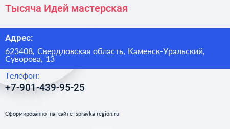 Тысяча Идей, мастерская по адресу 623408, Свердловская область, Каменск-Уральский, Суворова, 13 в дальнейшем Организация, размещена в следующих категориях: