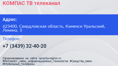КОМПАС-ТВ, телеканал по адресу 623400, Свердловская область, Каменск-Уральский, Ленина, 3 в дальнейшем Организация, размещена в следующих категориях:
