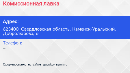 Комиссионная лавка по адресу 623400, Свердловская область, Каменск-Уральский, Добролюбова, 6 в дальнейшем Организация, размещена в следующих категориях:
