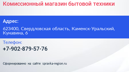 Комиссионный магазин бытовой техники по адресу 623400, Свердловская область, Каменск-Уральский, Кунавина, 6 в дальнейшем Организация, размещена в следующих категориях: