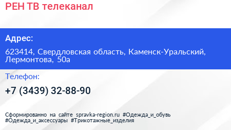 РЕН ТВ, телеканал по адресу 623414, Свердловская область, Каменск-Уральский, Лермонтова, 50а в дальнейшем Организация, размещена в следующих категориях: