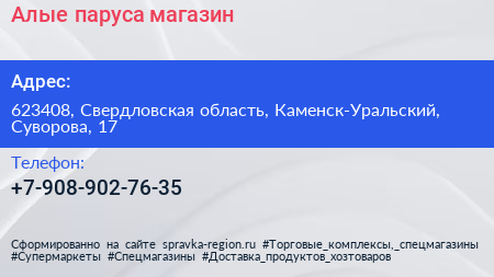 Алые паруса, магазин по адресу 623408, Свердловская область, Каменск-Уральский, Суворова, 17 в дальнейшем Организация, размещена в следующих категориях: