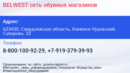 BELWEST, сеть обувных магазинов по адресу 623430, Свердловская область, Каменск-Уральский, Суворова, 32 в дальнейшем Организация, размещена в следующих категориях: