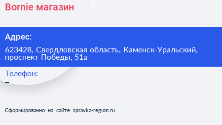 Bornie, магазин по адресу 623428, Свердловская область, Каменск-Уральский, проспект Победы, 51а в дальнейшем Организация, размещена в следующих категориях: