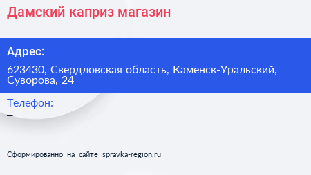 Дамский каприз, магазин по адресу 623430, Свердловская область, Каменск-Уральский, Суворова, 24 в дальнейшем Организация, размещена в следующих категориях: