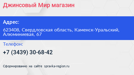 Джинсовый Мир, магазин по адресу 623408, Свердловская область, Каменск-Уральский, Алюминиевая, 67 в дальнейшем Организация, размещена в следующих категориях: