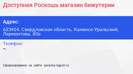 Доступная Роскошь, магазин бижутерии по адресу 623414, Свердловская область, Каменск-Уральский, Лермонтова, 83а в дальнейшем Организация, размещена в следующих категориях: