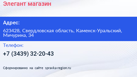 Элегант, магазин по адресу 623428, Свердловская область, Каменск-Уральский, Мичурина, 34 в дальнейшем Организация, размещена в следующих категориях: