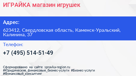 ИГРАЙКА, магазин игрушек по адресу 623412, Свердловская область, Каменск-Уральский, Калинина, 37 в дальнейшем Организация, размещена в следующих категориях: