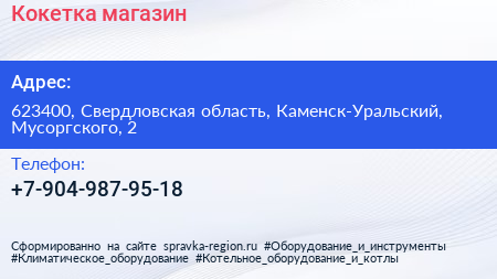 Кокетка, магазин по адресу 623400, Свердловская область, Каменск-Уральский, Мусоргского, 2 в дальнейшем Организация, размещена в следующих категориях: