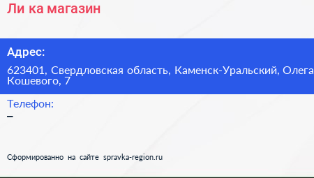 Ли-ка, магазин по адресу 623401, Свердловская область, Каменск-Уральский, Олега Кошевого, 7 в дальнейшем Организация, размещена в следующих категориях: