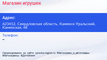 Магазин игрушек по адресу 623412, Свердловская область, Каменск-Уральский, Каменская, 48 в дальнейшем Организация, размещена в следующих категориях: