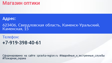 Магазин оптики по адресу 623406, Свердловская область, Каменск-Уральский, Каменская, 15 в дальнейшем Организация, размещена в следующих категориях: