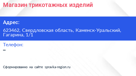 Магазин трикотажных изделий по адресу 623462, Свердловская область, Каменск-Уральский, Гагарина, 1/1 в дальнейшем Организация, размещена в следующих категориях: