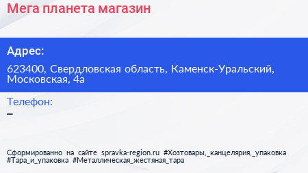 Мега планета, магазин по адресу 623400, Свердловская область, Каменск-Уральский, Московская, 4а в дальнейшем Организация, размещена в следующих категориях: