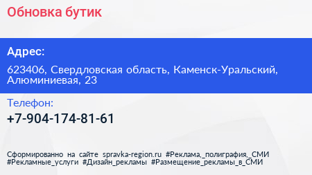 Обновка, бутик по адресу 623406, Свердловская область, Каменск-Уральский, Алюминиевая, 23 в дальнейшем Организация, размещена в следующих категориях: